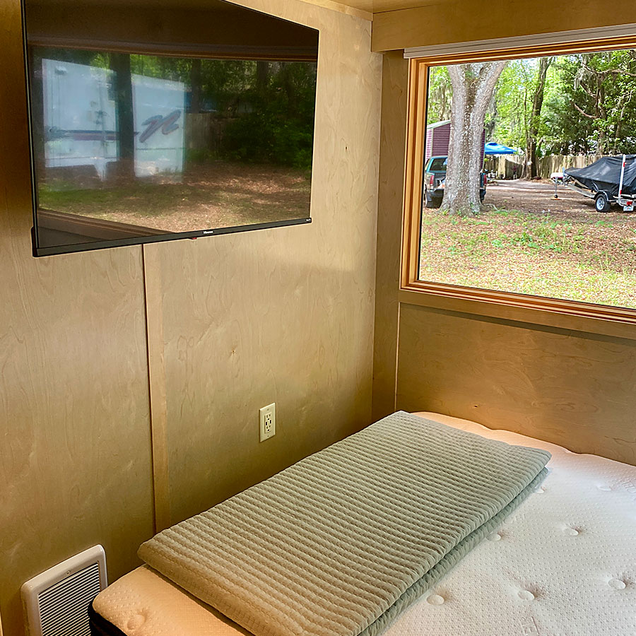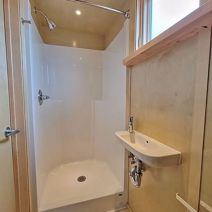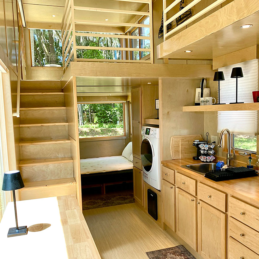 There is a bathroom with sink, full size shower and Toto toilet. High efficiency A/C heat pump, USB outlets, Full size windows and operable windows with window coverings. Great birch wood interior, solid butcher block counters and staircase with engineered composite floors. ESCAPEROO Tiny Home is well made and energy efficient.