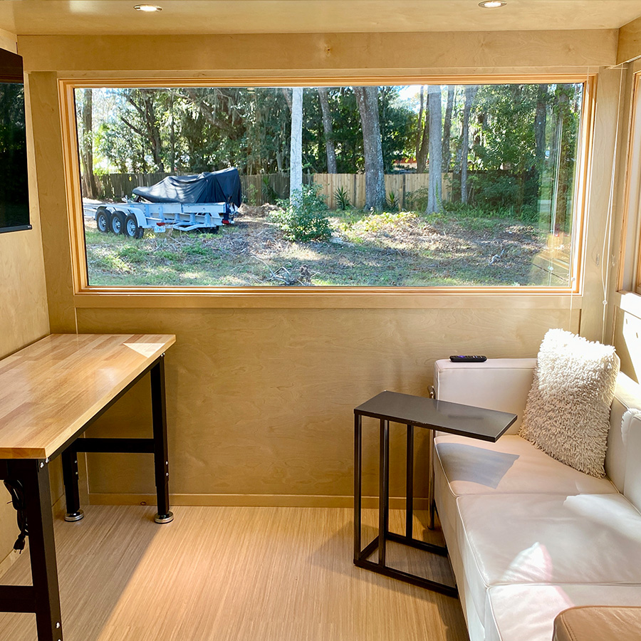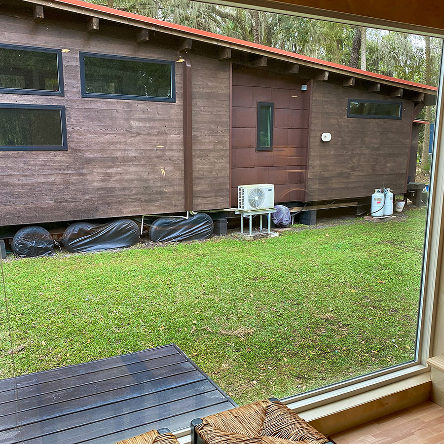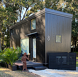 ESCAPEROO ONE is a Tiny Home located in New Smyrna Beach, Florida. It is 26’ long x 8.5’ wide x 13.5’ high and 408 Square Feet. The exterior is wooden with a 6' x 12' wooden deck. ESCAPEROO ONE has an upstairs double loft area for sleeping, storage and a desk. The downstairs has an open living area with lots of light and a modern kitchen with stove, oven, microwave, tall fridge and a washer/dryer combo.