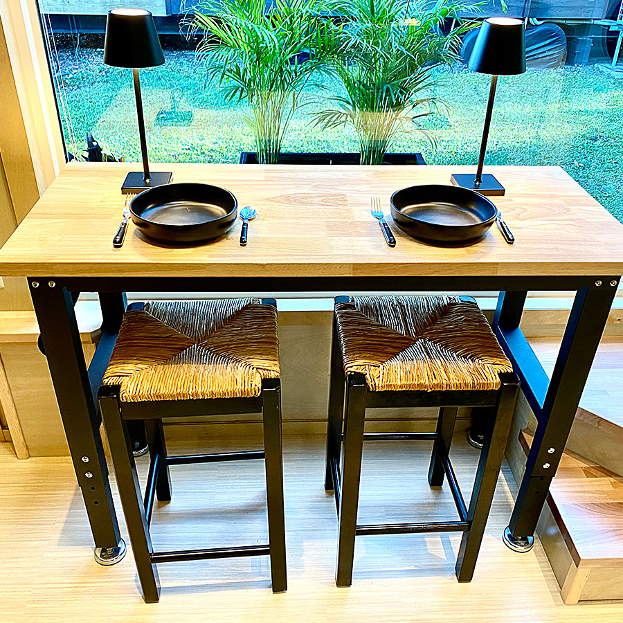 small dining table, outdoor deck, large windows,