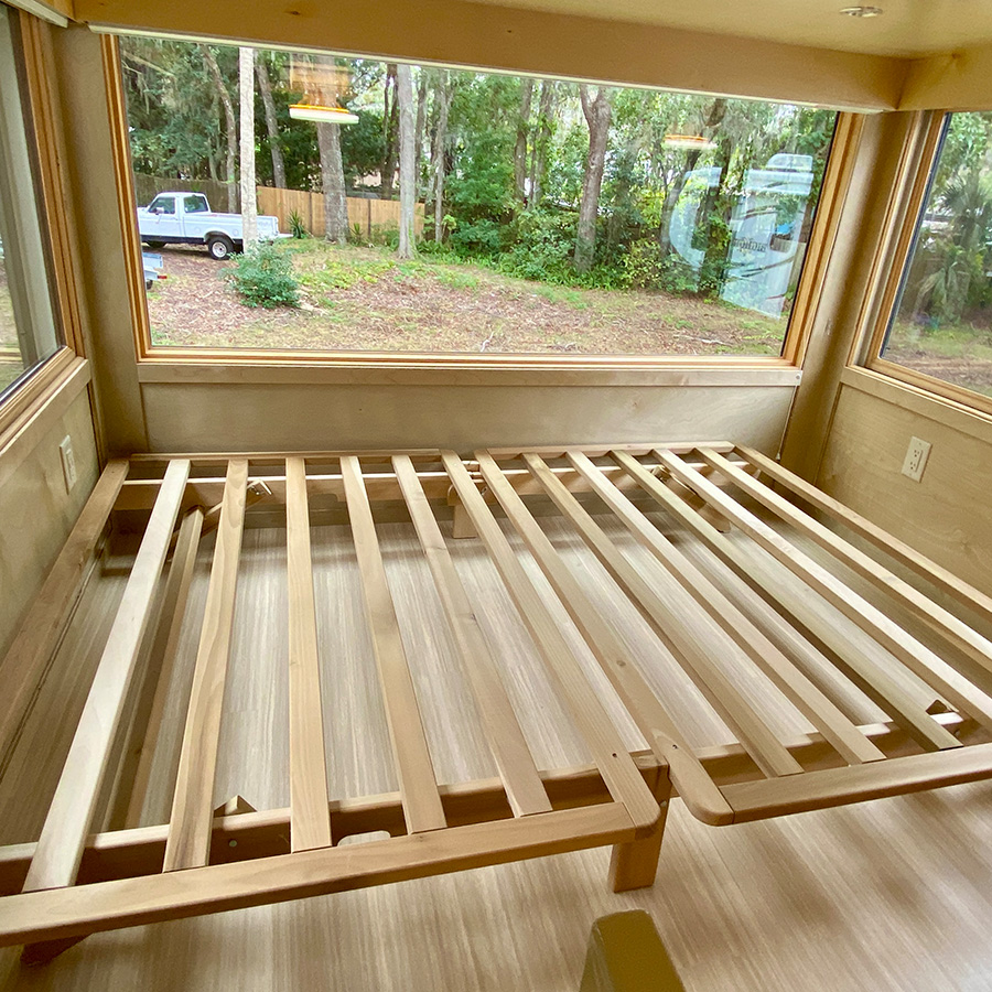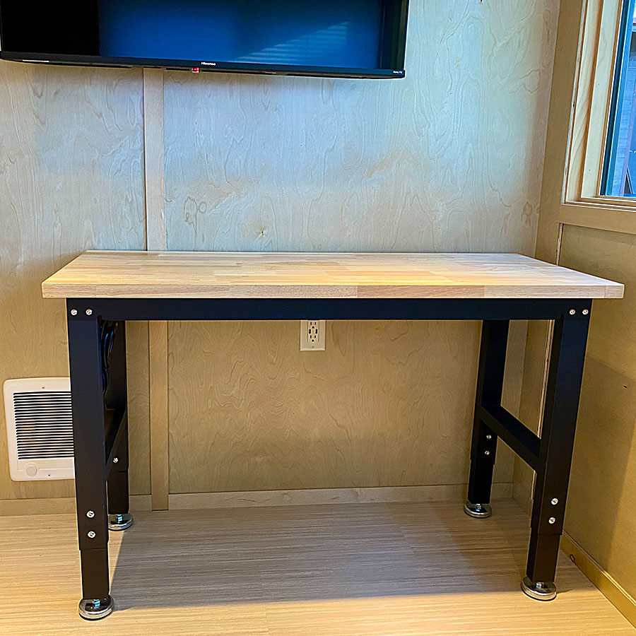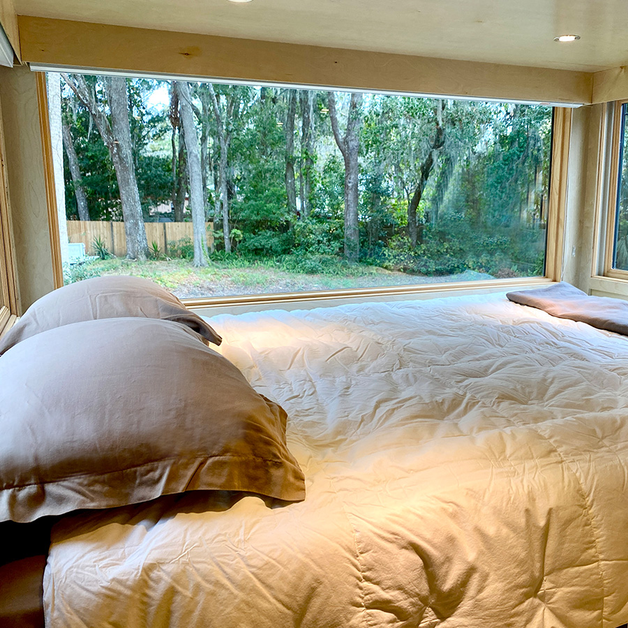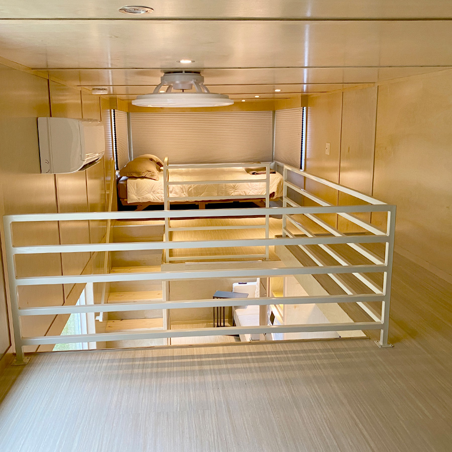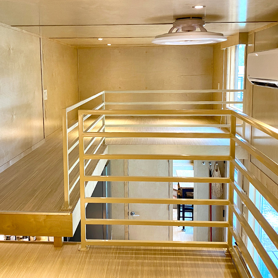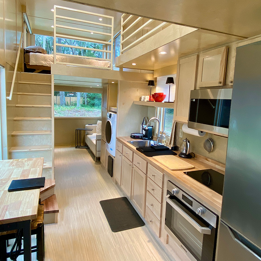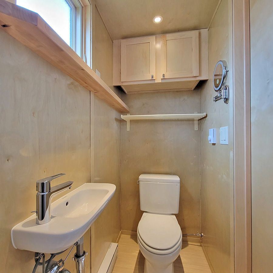 There is a bathroom with toilet, sink and full size shower. High efficiency A/C heat pump, USB outlets, Full size windows and operable windows with window coverings. Great maple wood interior, solid butcherblock counters and staircase with engineered composite floors. ESCAPEROO ONE Tiny Home is well made and energy efficient.