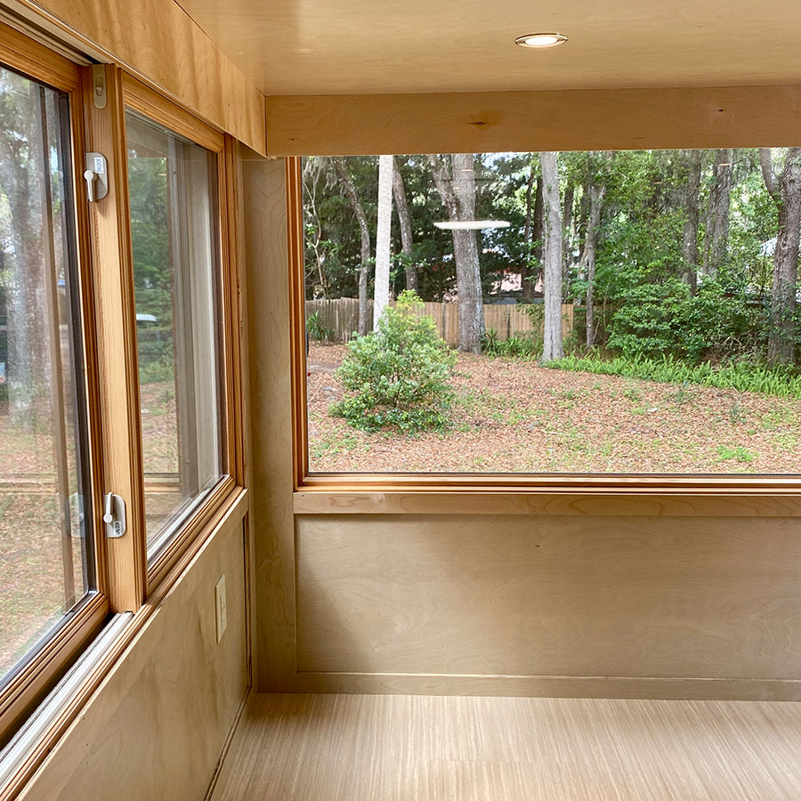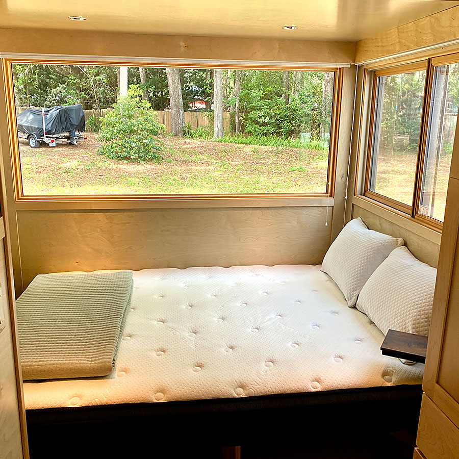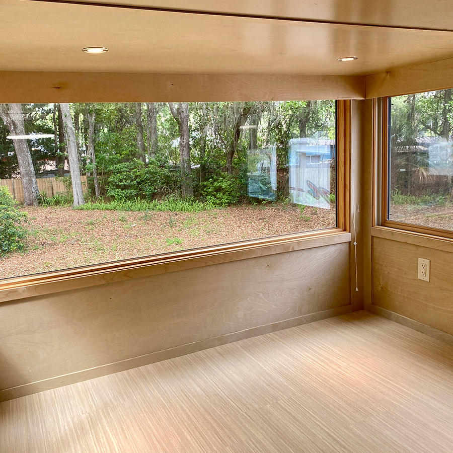 There is a bathroom with sink, full size shower and Toto toilet. High efficiency A/C heat pump, USB outlets, Full size windows and operable windows with window coverings. Great birch wood interior, solid butcher block counters and staircase with engineered composite floors. ESCAPEROO Tiny Home is well made and energy efficient.