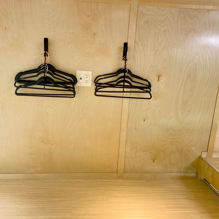 First loft has built in hangers for clothing. Collapsible hanger rack when not in use.